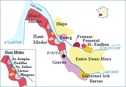 Médoc, området väster om Gironde och norr om staden Bordeaux, är indelat i två underdistrikt, de allmänna appellationerna, Médoc (tidigare Bas-Médoc) i norr och Haut-Médoc i söder.