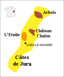 Jura (1600 ha) är ett gammalt vinområde som ligger vid Jurabergens fot, 10 mil öster om Bourgogneslätten, i departementet Jura (i regionen "Franche-Comté"). De flesta vingårdarna ligger i ett band, mellan städerna Arbois i norr och Lons le Saunier i söder, på 250 till 500 meters höjd (över havet). Man kan säga att denna uppodlade areal återfinns på sluttningar upp mot Jurabergen, speglande Côte d'Or, på andra sidan Saône (floden).