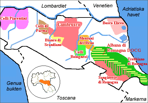 Emilia-Romagnas största vindistrikt/appellationer är: