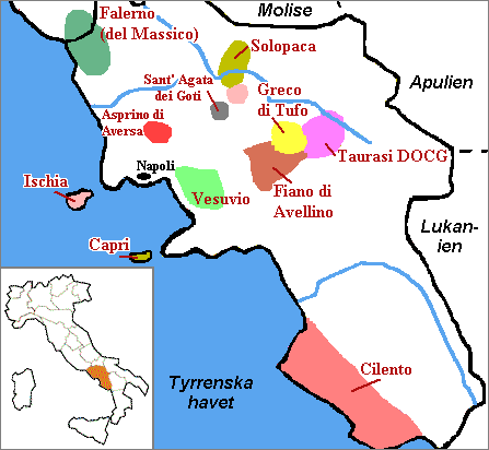 NAPOLI-provinsen, söder om Caserta och Benevento och väster om Avellino, omfattar appellationerna; Cami Flegrei - väster om huvudorten Napoli, Vesuvio - området kring vulkanen, Penisola Sorrentina - som täcker Sorrento halvön, och öarna Ischia och Capri. Bästa vinerna är nog de röda på druvan Piedirosso som betyder "röda fötter" från Campi Flegrei eller Vesuvio.