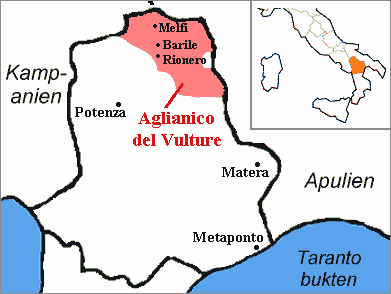 Basilicata, som ligger inklämt i "stövelns vrist" (mellan Kalibrien och Apulien), är ett kraftigt kuperat landskap som domineras av den slocknade vulkanen Mont Vulture. Det är också från odlingarna kring själva vulkanen som dom bästa vinerna kommer.