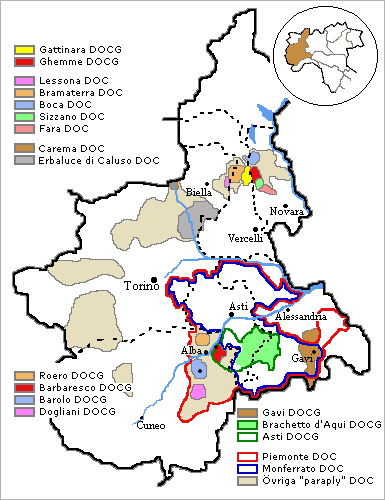Regionens (kanske också Italiens) främsta viner, och några av de mest uppskattade, är Barolo och Barbaresco. Båda, som har fått sina namn efter lokala byar, är helt baserade på Nebbiolo. Detta är två av de fyra (fem) DOCG appellationerna som är Nebbiolobaserade, de andra två beskrivs under egna rubriker nedan (Gattinara, Ghemme och Roero). Nebbiolo betyder "dimma" (eg. nebbia). För mer druvinformation se mer under den allmänna beskrivningen ovan.